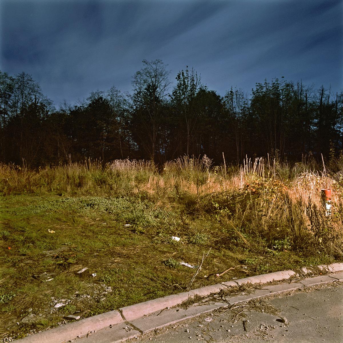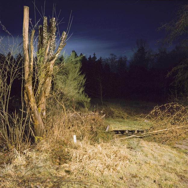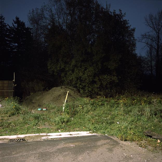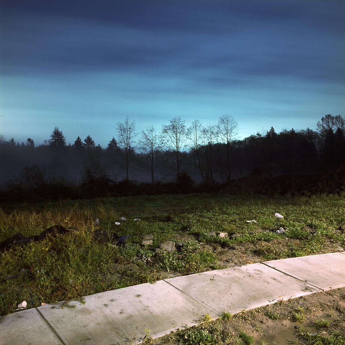 The crepuscule images have an “uncanny” presence to them, in the Freudian sense of the word as unsettlingly familiar. They are an attempt to see the strange world we create but fail to perceive because of its familiarity. The landscape beyond the wash of street lamps, buildings and car headlights has come to exist as a backdrop, registering in our minds only as “tree”, “thicket” or “field”. The relative darkness of these areas is left unexplored for its lack of interest. We are creating a world where darkness is becoming a misnomer, and twilight hangs over us like an uneasy blanket of sleep.